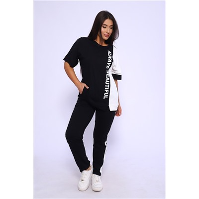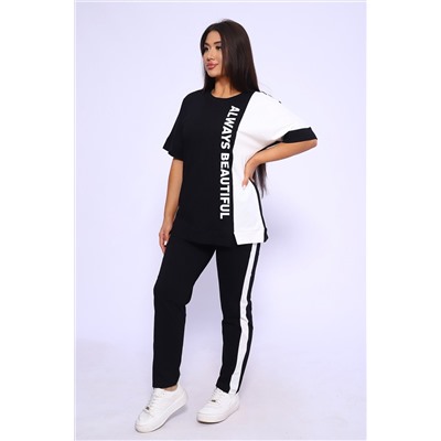 Эффектный костюм в спортивном стиле из трикотажного полотна ярких оттенков. В комплекте представлена кофта свободного кроя со спущенным рукавом и узкие, но не обтягивающие брюки. Изюминкой костюма является сочетание контрастных цветов в дизайне кофты в виде крупных латинских букв и целых вставок. Трикотажные костюмы стали одним из самых популярных и востребованных атрибутов в гардеробе современных женщин, так как не только подчеркивают стиль и индивидуальность, но и обеспечивают комфорт и удобство в повседневной жизни.