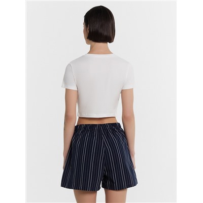 Футболка женская прилегающего силуэта. Горловина круглой формы, горловина окантована бейкой из основного полотна. Рукав втачной короткий. Футболка укороченная.