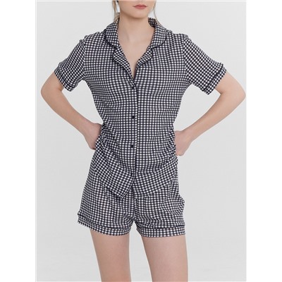 Хлопковый женский комплект актуального свободного силуэта. Рубашка прямая, с отложным воротником и лацканами, короткими рукавами, застегивается на пуговицы. Дополняют ее свободные шорты длины мини, с резиновой тесьмой в поясе и атласной тесьмой, которая завязывается на бантик. Особенность модели – контрастные канты на рукавах, воротнике и передней части рубашки. Рекомендуем для сна, отдыха и домашних дел!