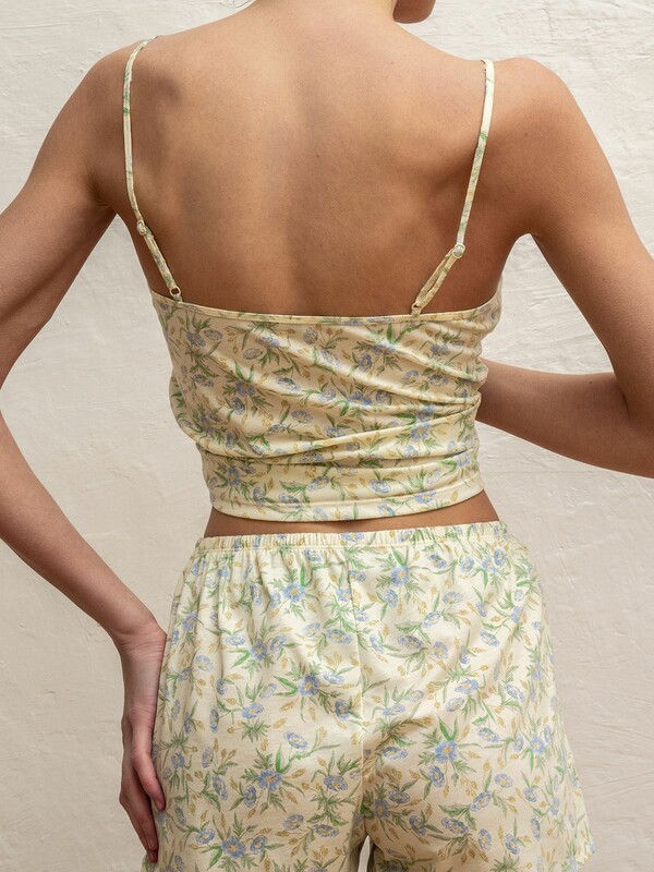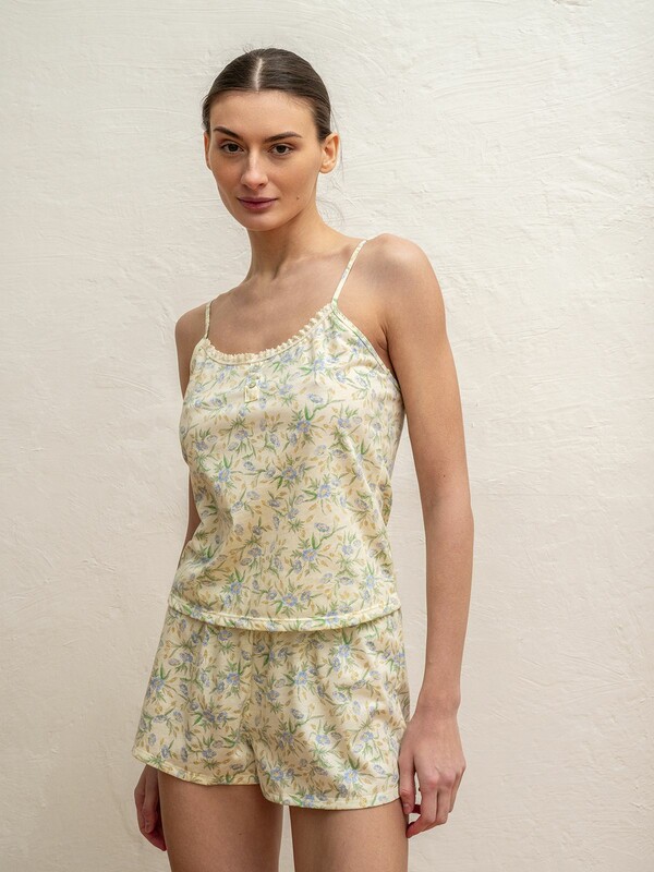 Пижама состоит из майки и шорт. Майка на тонких регулируемых бретелях имеет две декоративный пуговицы в зоне декольте. Передняя часть верхнего выреза обрамлена кружевной каймой. Шорты на тонкой мягкой резинке. Пижама выполнена в молочным цвете с нанесённым на неё цветочным принтом. 65% Полиэстер 35% Хлопок Комментарии к товару