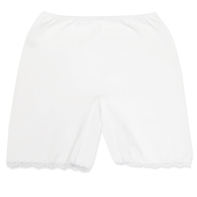 Трусики-шортики для девочки, белого цвета, из эластичного однотонного х/б трикотажа. В поясе спереди, на широком поясе из трикотажа, сзади на тонкой резинке с фестончатым краем. В проймах отделаны эластичным кружевом. Комментарии к товару