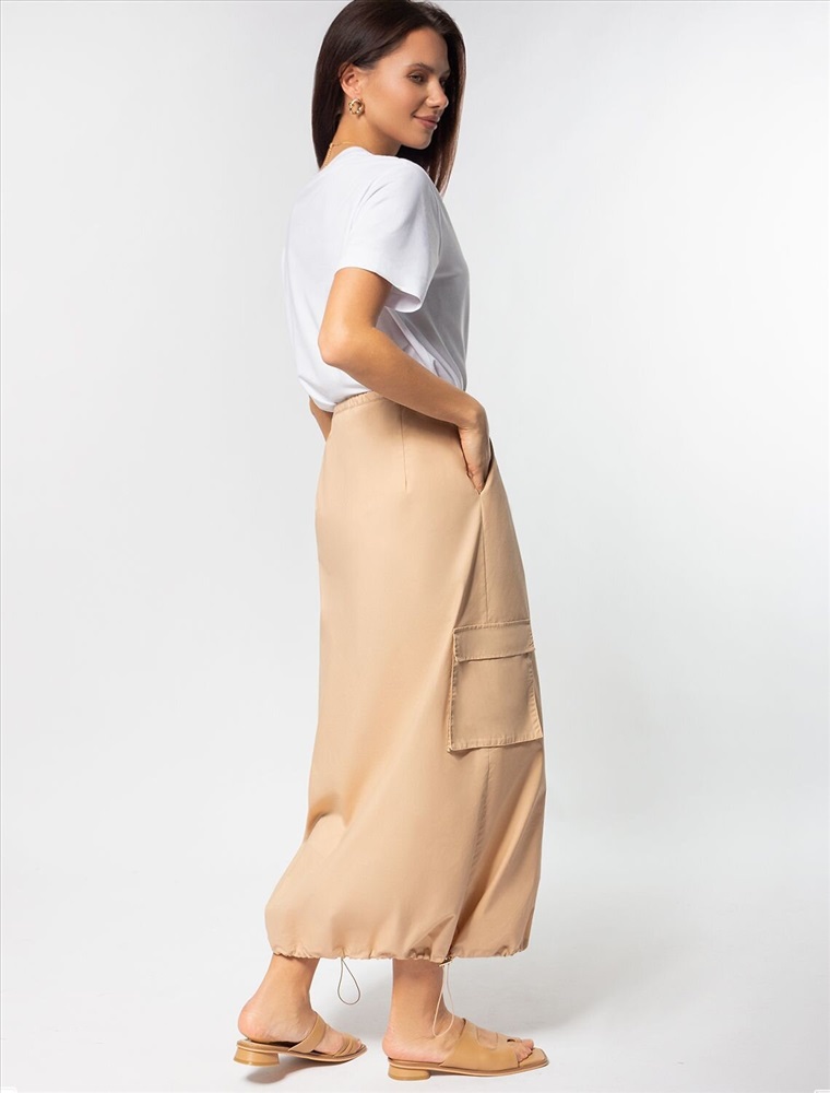 Трендовая юбка «карго» с поясом на резинке выполнена из плотного поплина. Низ изделия сделан на кулиске, что позволяет регулировать форму, используя платье по-разному в зависимости от образа. Материал прочный и износостойкий, но при этом мягкий и удобный, отлично подходит для повседневной носки, гарантируя абсолютный комфорт. Модель дополнена боковыми и двумя накладными карманами.