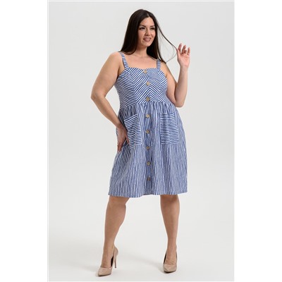 Сарафан женский на широких бретелях, отрезной по линии талии. Застежка на петли -пуговицы. В верхней части полочки и спинки рельефы. Нижняя часть сарафана имеет небольшую сборку по шву притачивания, два накладных кармана. Сарафан смотрится оригинально за счет подбора полосы в деталях под разным углом.