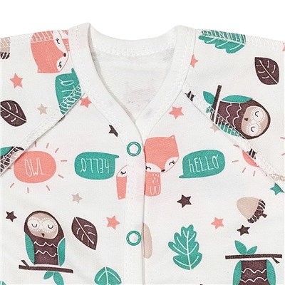 Утепленный комбинезон свободного кроя для новорожденных девочек. Изготовлен из трикотажного полотна - футер, с мягкой изнанкой начесом, с нанесением рисунка "Совы и лисы". Модель с закрытыми носочками, швами наружу. Горловина и планка отделаны трикотажным кантом. Длинный рукав-реглан, заканчивается варежкой-антицарапкой. Застёжка комбинезона выполнена в виде удобных кнопок по центру, по всей длине туловища, и по штанишкам. Штанишки с ластовицей.