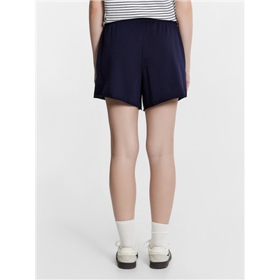 Шорты прямые, короткие. Посадка средняя. Пояс цельнокроеный с эластичной тесьмой внутри (вн. 40мм 40RV). В боковых швах обработаны карманы. Подкладка карман из основного полотна. Нижние срезы шорт с «сырым срезом».
