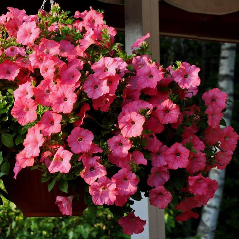 Мощный каскад с крупными цветками! Растения быстрорастущие, хорошо ветвящиеся. Плети сильные, устойчивы к ломкости, длиной до 80-100 см. Формирует множество крупных цветков нежной розовой окраски с белой горловиной. Цветение продолжительное. Размер цветка 5-7 см. Отличная устойчивость к неблагоприятным погодным условиям. Великолепно подходит для подвесных корзин, кашпо, балконных ящиков. Растение светолюбивое, засухоустойчивое, хорошо растет на любых питательных почвогрунтах. При выращивании рассады посевы проводят в феврале-марте. Семена слегка вдавливают в почву. Посадочную емкость накрывают стеклом и ставят в освещенное место. При температуре почвы +18 C всходы появляются на 14-20 день. Сеянцы пикируют в фазе 2-х настоящих листьев. Рассаду высаживают после окончания весенних заморозков. Чтобы получить идеальное растение в корзине, куст петунии надо формировать, прищипывая побеги.