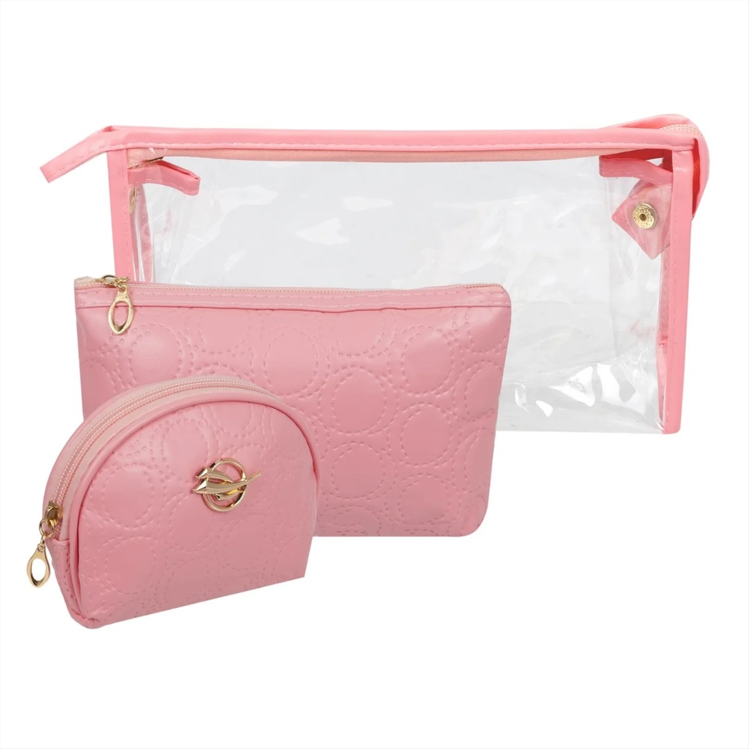 Косметички выполнены из прочного прозрачного ПВХ и полиуретана с текстурированной поверхностью с имитацией стеганой прошивки в виде кругов. Такие аксессуары позволяют не только организовать пространство в дамской сумочке, рюкзаке или чемодане, но и быстро находить необходимые принадлежности, что особенно актуально во время поездок.