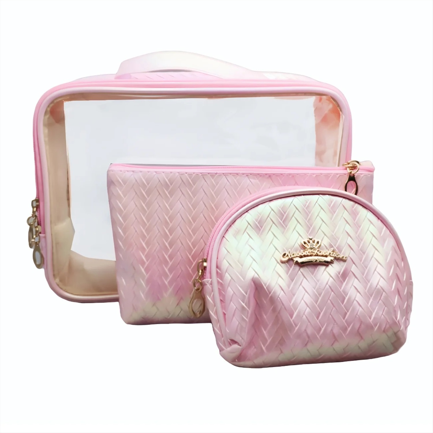 Косметички выполнены из прочного прозрачного ПВХ и полиуретана и с текстурированной поверхностью в виде вязки. Такие аксессуары позволяют не только организовать пространство в дамской сумочке, рюкзаке или чемодане, но и быстро находить необходимые принадлежности, что особенно актуально во время поездок.