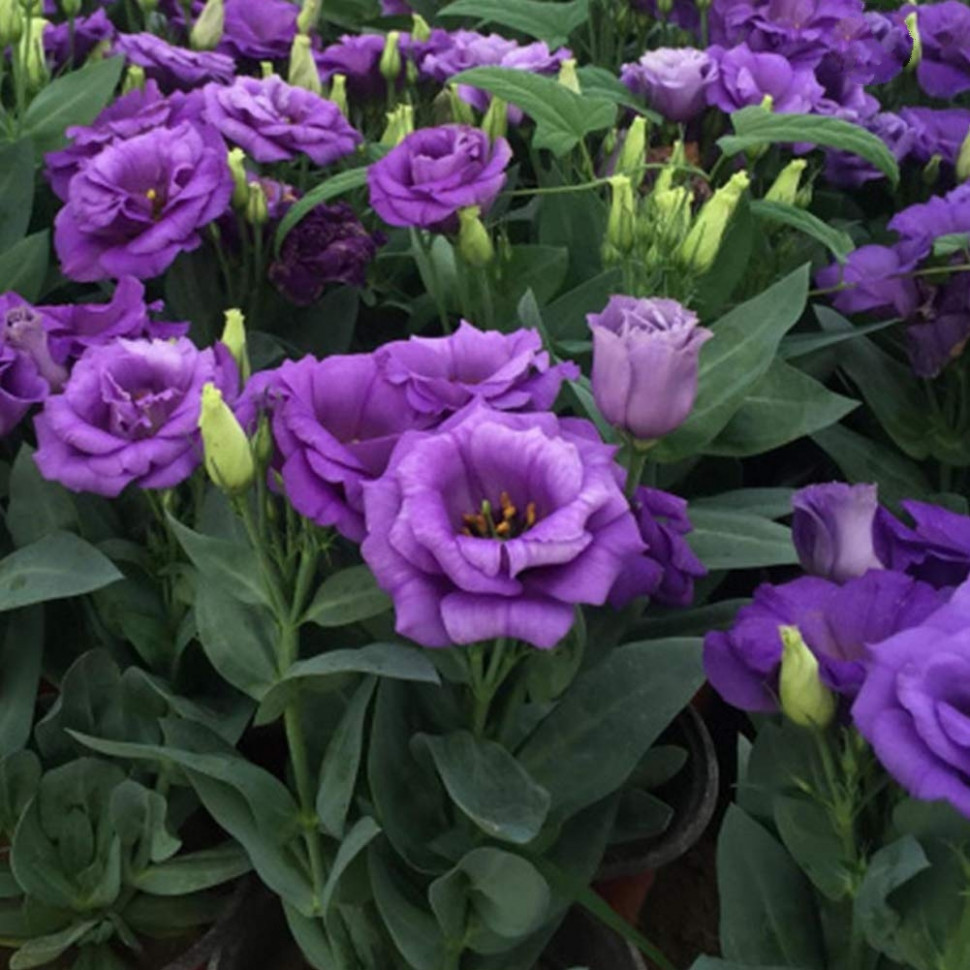 Это компактное низкорослое растение достигает высоты от 20 до 25 сантиметров. Культура обладает хорошей ветвистостью и имеет небольшие зеленые листья с сизоватым оттенком. Цветки эустомы Кармен Блю представляют собой крупные махровые бутоны в форме розочек. Лепестки плотные и элегантно сложены, что создает привлекательный вид. Они окрашены в глубокий сине-фиолетовый цвет, который придает этому растению особую привлекательность. Период цветения продолжается с июня по сентябрь, что делает его долгоживущим.