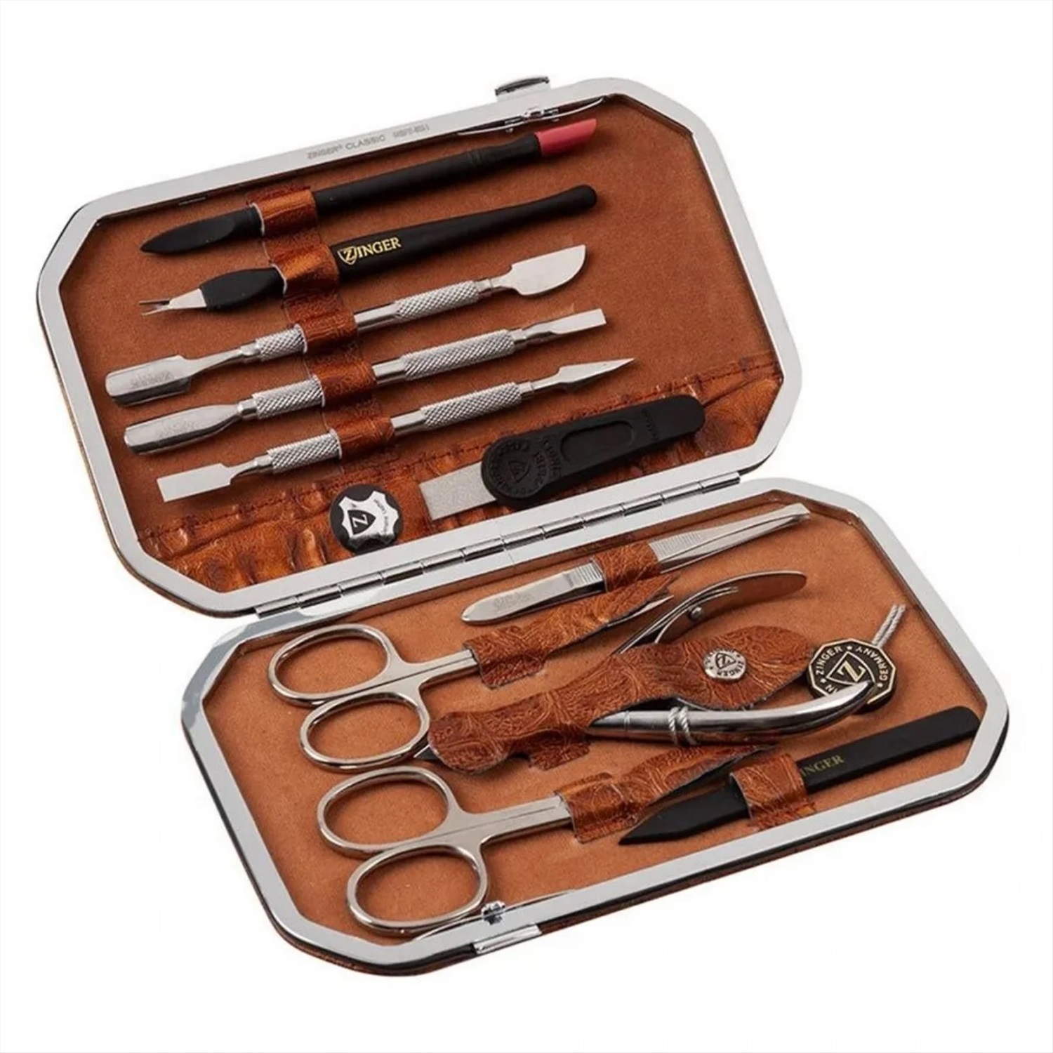 Компактный и стильный маникюрный набор 11 предметов Zinger MSFE-802-1 S. Он удобен для домашнего использования и путешествий. Укомплектован профессиональными инструментами. Каждый инструмент в маникюрном наборе профессионально заточен: (кусачки, ножницы, пинцеты).