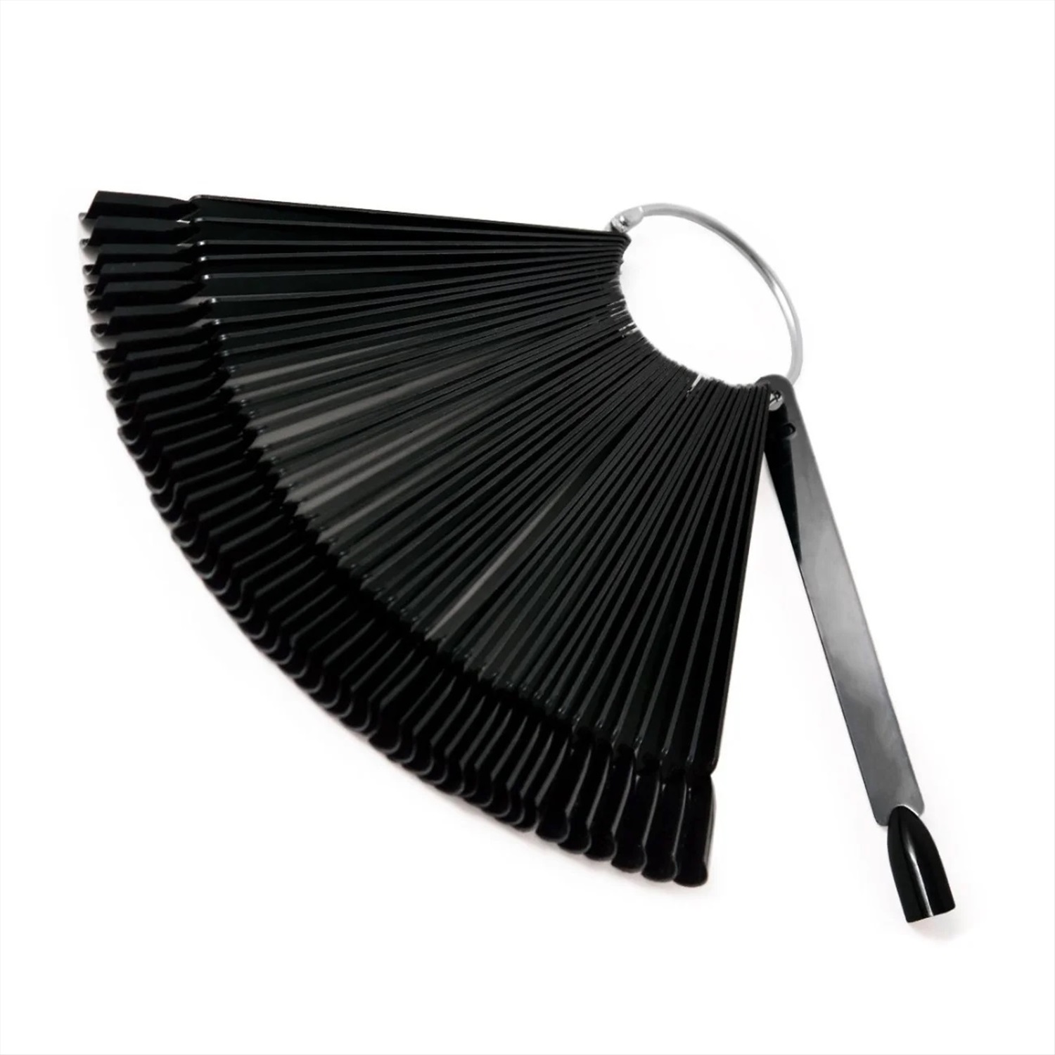 Веерная палитра изготовлена из пластика, она станет удобным инструментом для работы мастеров и начинающих специалистов маникюра. Металлическое кольцо плотно закрывается, но при этом достаточно легко открывается для удаления или добавления типс. Количество — 50 шт.