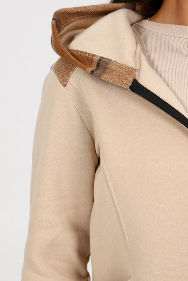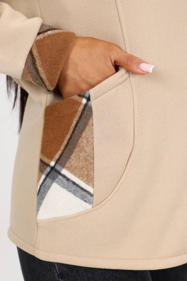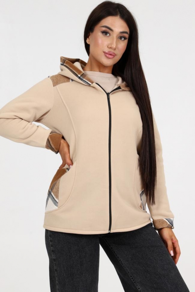 Женская толстовка на молнии с капюшоном. Изделие прямое, длинный рукав на манжете, передняя полочка декорирована рельефными швами, имеются карманы. Хорошо подойдет для прохладных весенних вечеров.