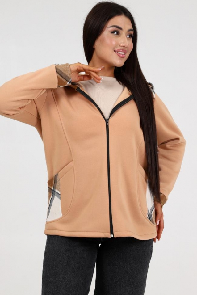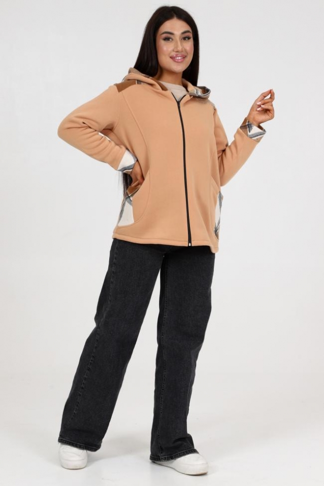 Женская толстовка на молнии с капюшоном. Изделие прямое, длинный рукав на манжете, передняя полочка декорирована рельефными швами, имеются карманы. Хорошо подойдет для прохладных весенних вечеров.