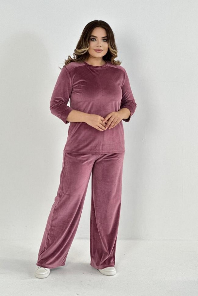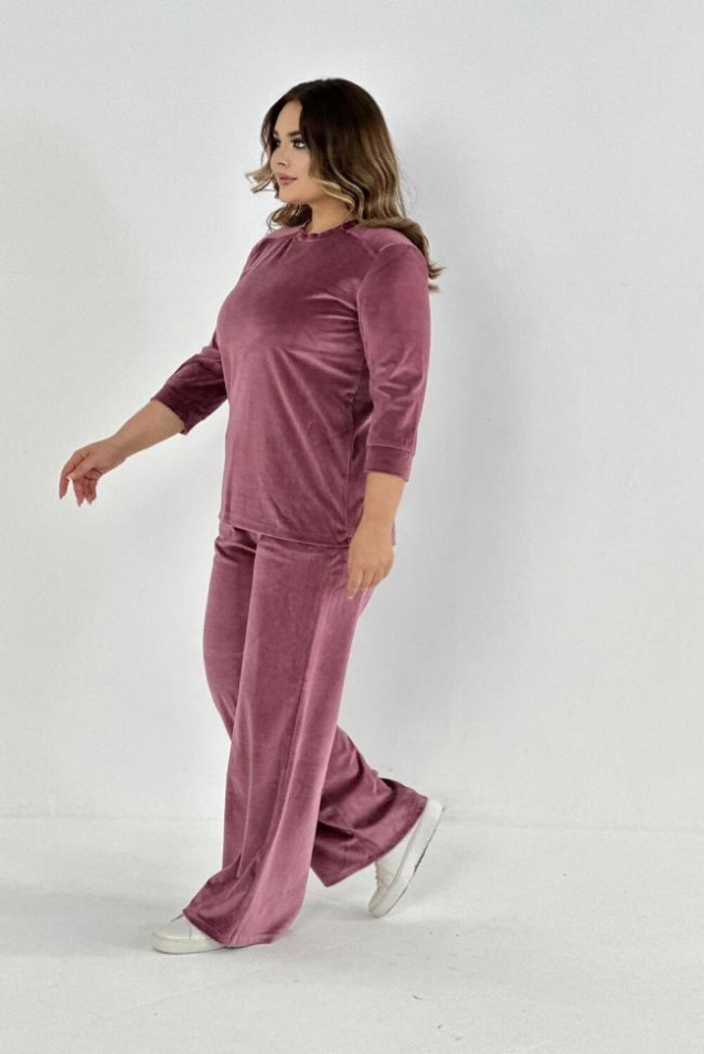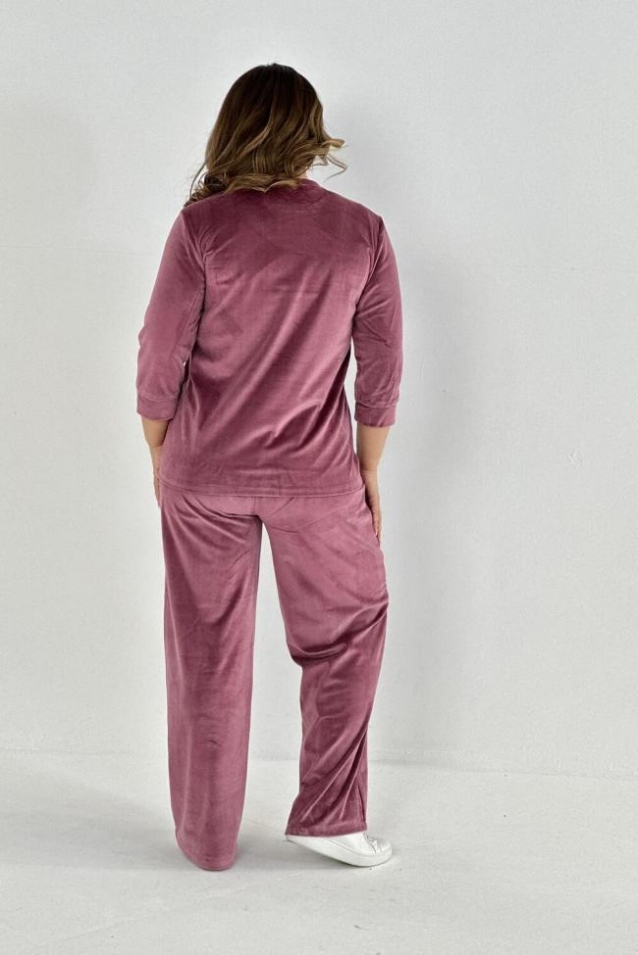 Костюм женский двойка штаны + кофта выполнен из плотной и мягкой ткани велюр. Брюки с карманами и поясом на резинке, у кофты округлый воротник и рукав 3/4 на манжете. Комплект прямого свободного силуэта, Идеального подходит для повседневной носки.