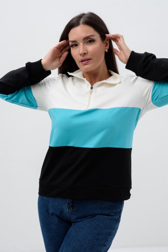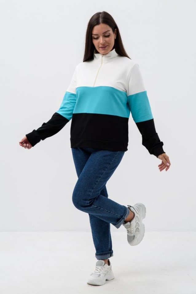 Женская толстовка сделана из легкой и удобной ткани. Длинный рукав на манжете обеспечивает тепло и защиту от ветра, а пояс на манжете позволяет регулировать объем и создавать индивидуальный силуэт. Особое внимание привлекает горло на молнии, которое не только добавляет функциональности, но и становится стильным акцентом в общем образе. Легко сочетается с различными элементами гардероба, создавая множество интересных образов. Толстовка - это практичный элемент вашего гардероба, который поможет вам чувствовать себя уверенно и комфортно в любое время года.