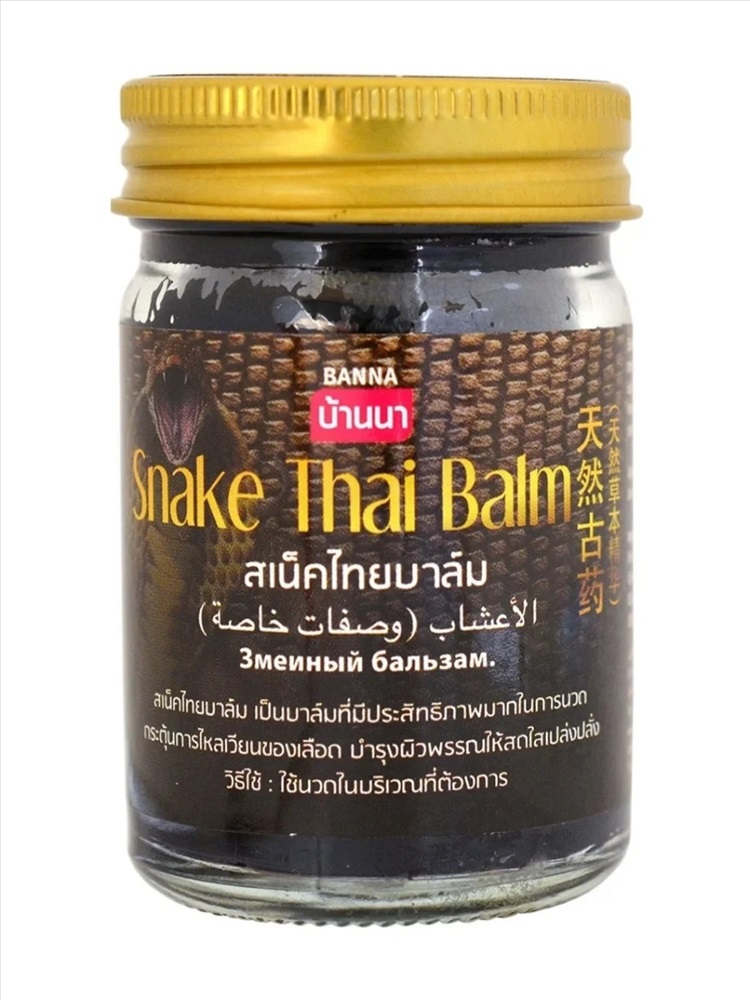 SNAKE THAI BALM, Banna хорошо впитывается в кожу, быстро облегчает боль в мышцах и суставах, отлично помогает при растяжениях, ушибах, защемлении нервов, является замечательной профилактикой радикулита, остеохондроза, ревматизма и невралгии. Укрепляет кости, эффективен для сращивания костей после переломов. SNAKE THAI BALM, Banna широко популярен по всему миру. Он сочетает в себе высокую эффективность, удобную для массажа и нанесения консистенцию и уникальную формулу.
