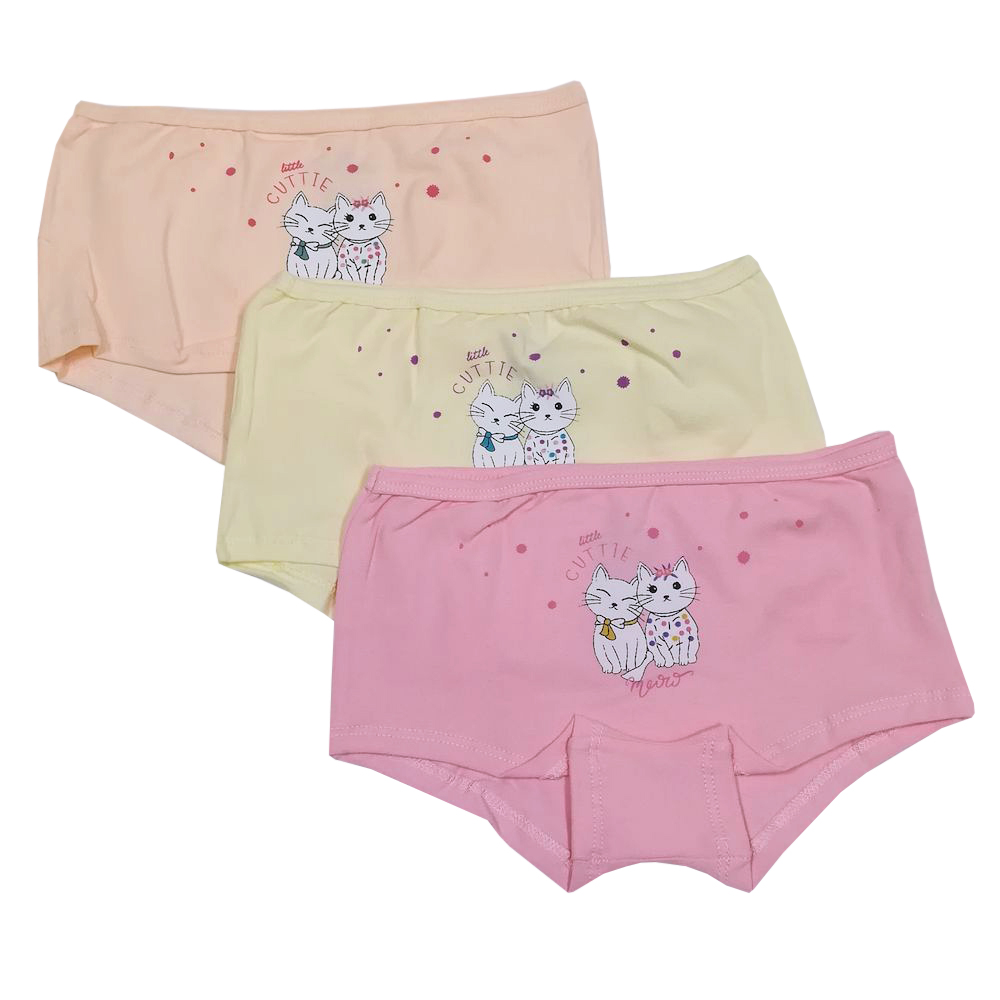 Трусики-шортики для девочки из эластичного х/б трикотажа, с нежным принтом "Милашки, кошечки". В поясе на закрытой резинке. Проймы с подворотом прошиты двойной сточкой. Комментарии к товару
