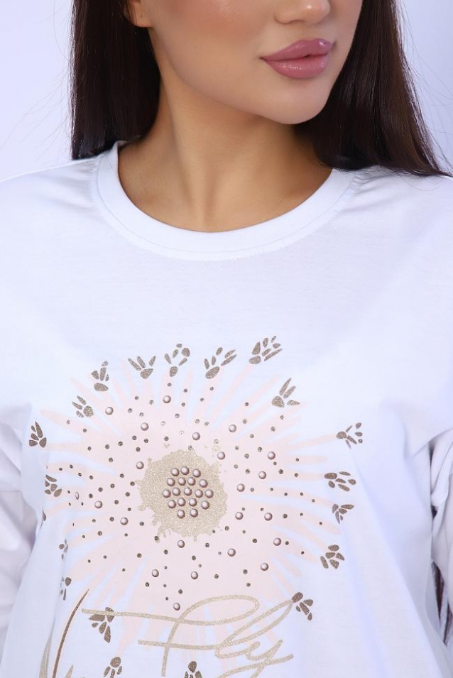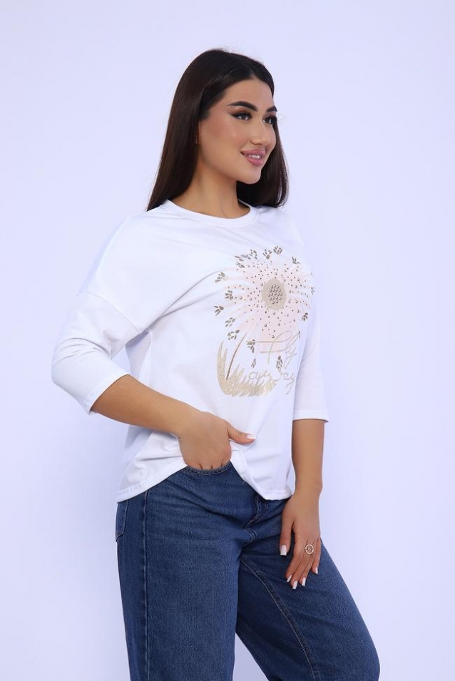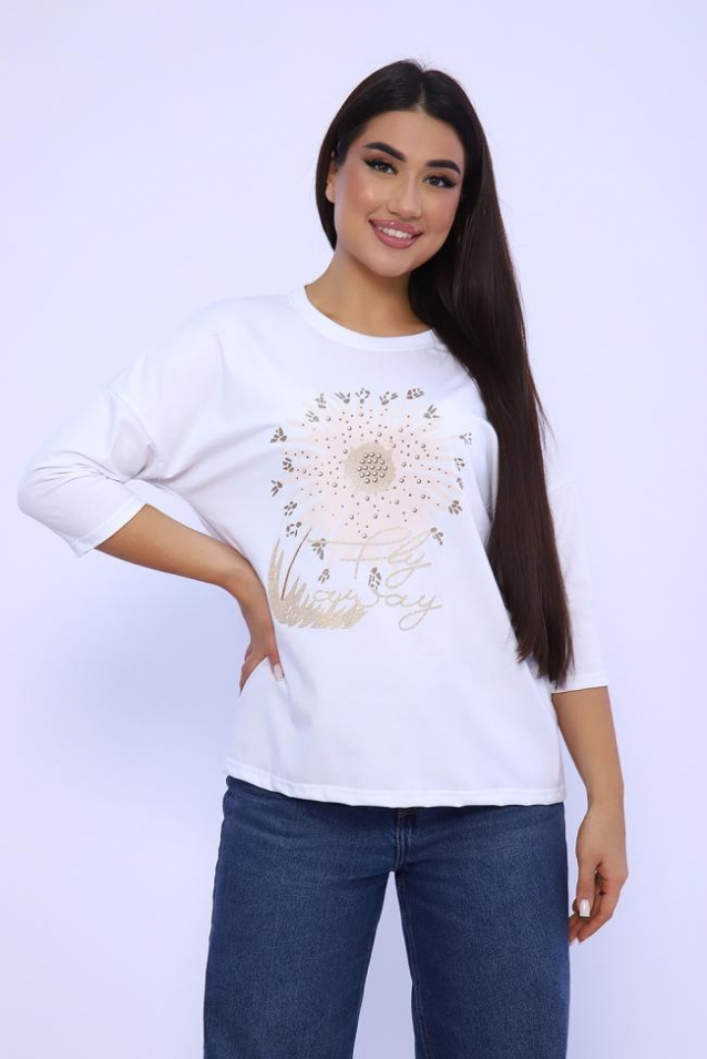 Женский лонгслив - футболка с рукавом 3/4, изготовлена из гладкого трикотажного полотна с оригинальным принтом, разнообразит ваш ежедневный образ. Футболка будет хорошим дополнением к джинсам, брюкам. Рукав 3/4 очень актуален в любую погоду!