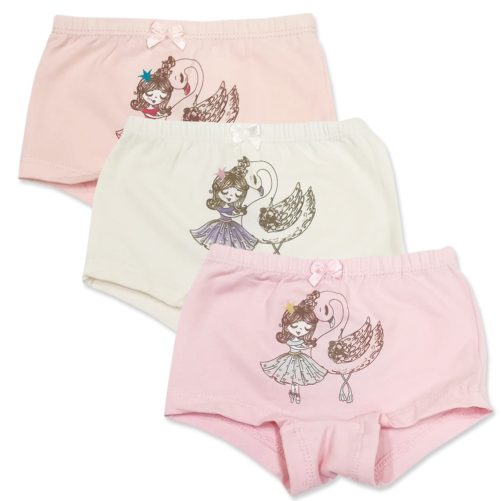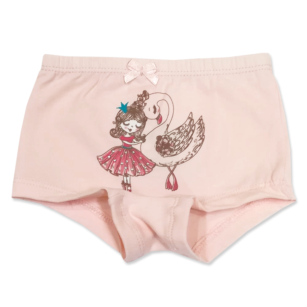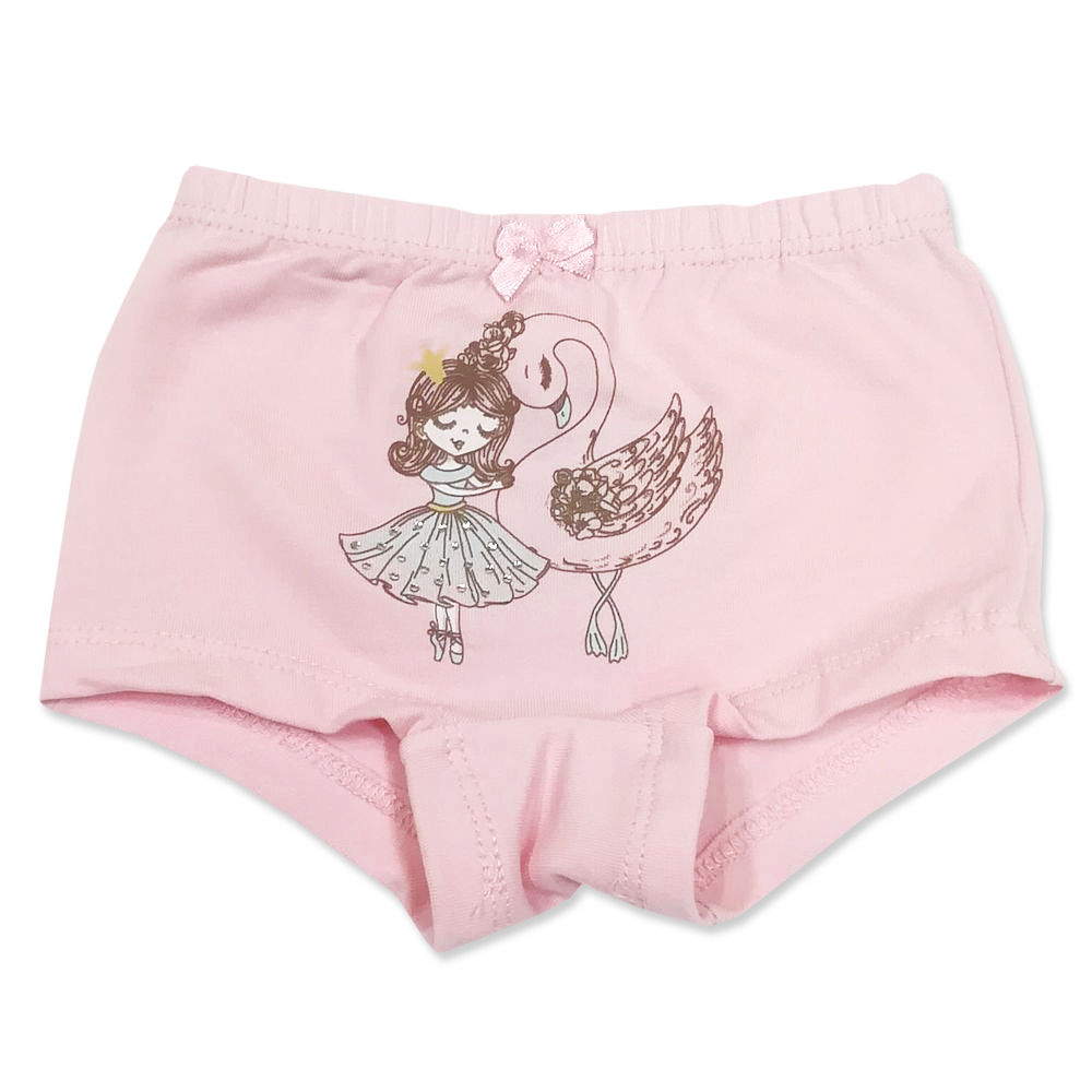 Трусики-шортики для девочки, из эластичного, х/б трикотажа с красочным принтом "принцесса и лебед" со стразами. В поясе на закрытой резинке. Проймы с подворотом. Украшены атласным бантиком.
