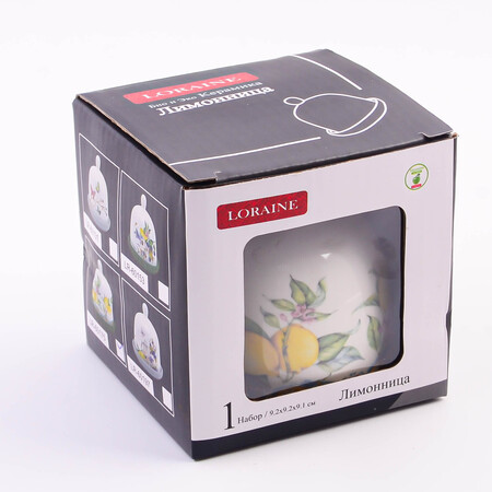 Лимонница с крышкой LORAINE - это прекрасный аксессуар для любителей свежих цитрусовых. Красивая лимонница изготовлена из БИО и ЭКО доломитовой керамики высокого качества и украшена красивым цветочным рисунком с бабочками. Керамика один из лучших материалов для использования в быту, долговечна и отлично впишется в любой интерьеркухни. Набор состоит из двух предметов - блюдце и крышка. Для удобства использования свеху на крышке есть ручка. Удобный контейнер для хранения лимонов надежно защищает содержимое от посторонних запахов и заветривания. Оригинальный дизайн и качество исполнения сделают тарелку для лимона настоящим украшением стола и подчеркнет прекрасный вкус хозяйки. Благодаря своей форме, она подходит для хранения не только лимона, но и других цитрусовых фруктов. Керамическая посуда подходит для использования в микроволновой печи, холодильнике и посудомоечной машине. Изделие упаковано в индивидуальную коробку. Такая лимонница керамическая прекрасно подойдет для вашей кухни и будет отличным подарком для друзей и близких..