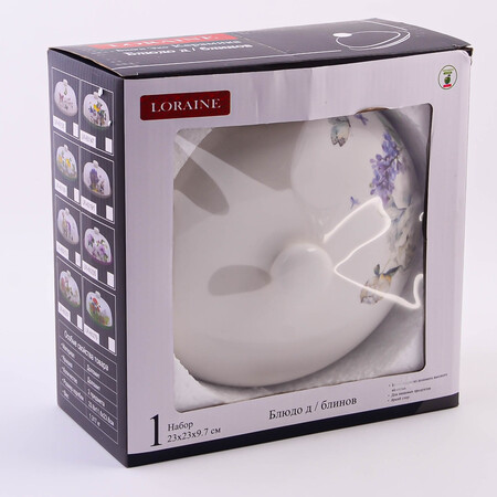Блюдо для блинов LORAINE подойдет для красивой сервировки стола, для подачи блинов, закусок, фруктов, овощей, выпечки и многого другого. Блинница с крышкой изготовлена из БИО и ЭКО доломитовой керамики высокого качества и украшена красивым цветочным рисунком, который придаст настроения вашему чаепитию. Набор состоит из блюда и крышки. Изделие вместительное, элегантной формы с удобной ручкой на крышке. Крышка надежно закрывает блюдо, обеспечивая сохранение температуры блинов перед подачей на стол, а также защищает их от попадания влаги, посторонних запахов и заветривания. Под ней пища долго не остынет и сохранит свой первозданный вид и аромат. Оригинальный дизайн и качество исполнения сделают блюдо для сервировки настоящим украшением стола и подчеркнет прекрасный вкус хозяйки. Доломитовая посуда подходит для использования в микроволновой печи, холодильнике и посудомоечной машине. Упаковано в индивидуальную коробку. Такое блюдо для блинов с крышкой прекрасно подойдет для вашей кухни и будет отличным подарком для друзей и близких.