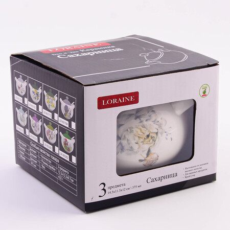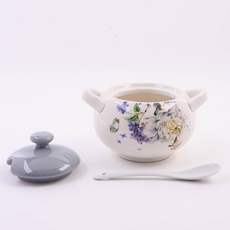 Сахарница с крышкой и ложкой LORAINE - это отличное решение для хранения вашего сахара в чистоте и порядке. Изготовлена из БИО и ЭКО доломитовой керамики высокого качества и украшена красивым цветочным рисунком с бабочками. Сахарница закрывается удобной крышкой, благодаря которой содержимое надежно защищено от влаги и высыхания. В комплекте идет небольшая керамическая ложечка, которая помогает удобно дозировать нужное количество сахара. Оригинальный дизайн и качество исполнения сделают такую емкость для сахара, варенья, меда настоящим украшением стола к чаепитию. Изделие упаковано в индивидуальную коробку. Подходит для мытья в посудомоечной машине. Керамическая посуда для сахара - это отличное решение для тех, кто хочет сохранить свои продукты в чистоте и порядке, а также придать своей кухне особый шарм.