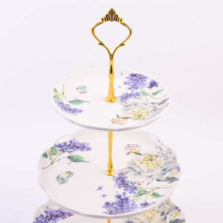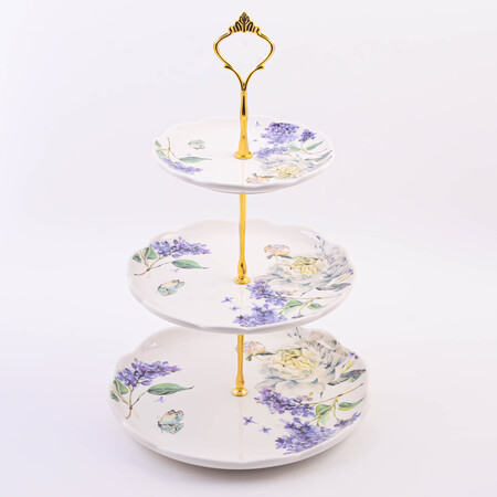 Остаток: 98 Материал: доломит, металл. Цвет: белый, Фиолетовый , желтый. Рисунок: цветы Размеры в собранном виде: 24,8 х 24,8 х 34 см. Нижний ярус: размеры 24,8 см. Средний ярус: диаметр 20 см. Верхний ярус: диаметр 15,2 см. Диамтер дна: 18,3 см. Высота: 34 см. Размер упаковки: 25 х 25 х 6 см. Упаковка: коробка. Вес без упаковки: 1,218 кг. Вес с упаковкой: 1,333 кг. Страна производитель: Китай. Элегантная конфетница с тремя ярусами LORAINE станет настоящим украшением любого стола, поможет хозяйке красиво подать конфеты, фрукты, орехи, выпечку, овощи и даже закуски из мясных и сырных деликатесов. Блюдо выполнено из БИО и ЭКО доломитовой керамики высокого качества и украшена красивым цветочным рисунком с бабочками. Стойка-держатель выполнена из металла с золотым покрытием. Благодаря своей трехъярусной конструкции, этажерка на стол позволит вам разместить большое количество сладостей. Основание фруктовницы обеспечивает ей высокую устойчивость, что делает ее безопасной для использования даже на самых неровных поверхностях. Вы можете быть уверены, что ваша ваза для фруктов будет стоять надежно, не опасаясь, что она может перевернуться или сломаться. Фруктовница трехъярусная прекрасно подойдёт под любой интерьер и будет сочетаться с сервировочной посудой, а компактные размеры позволят разместить ее даже на небольшом праздничном столе. Эта красивая посуда для дома украсит сервировку вашего стола и подчеркнет прекрасный вкус хозяина, а также станет отличным подарком.