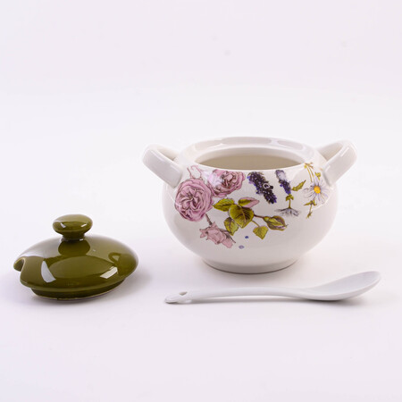 Сахарница с крышкой и ложкой LORAINE - это отличное решение для хранения вашего сахара в чистоте и порядке. Изготовлена из БИО и ЭКО доломитовой керамики высокого качества и украшена красивым цветочным рисунком с бабочками. Сахарница закрывается удобной крышкой, благодаря которой содержимое надежно защищено от влаги и высыхания. В комплекте идет небольшая керамическая ложечка, которая помогает удобно дозировать нужное количество сахара. Оригинальный дизайн и качество исполнения сделают такую емкость для сахара, варенья, меда настоящим украшением стола к чаепитию. Изделие упаковано в индивидуальную коробку. Подходит для мытья в посудомоечной машине. Керамическая посуда для сахара - это отличное решение для тех, кто хочет сохранить свои продукты в чистоте и порядке, а также придать своей кухне особый шарм.