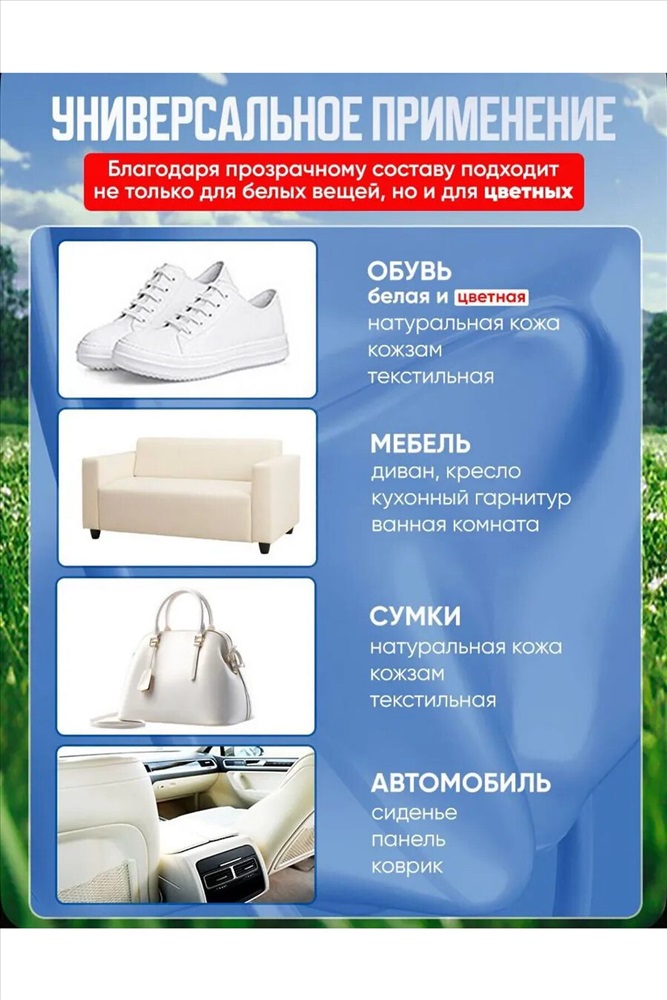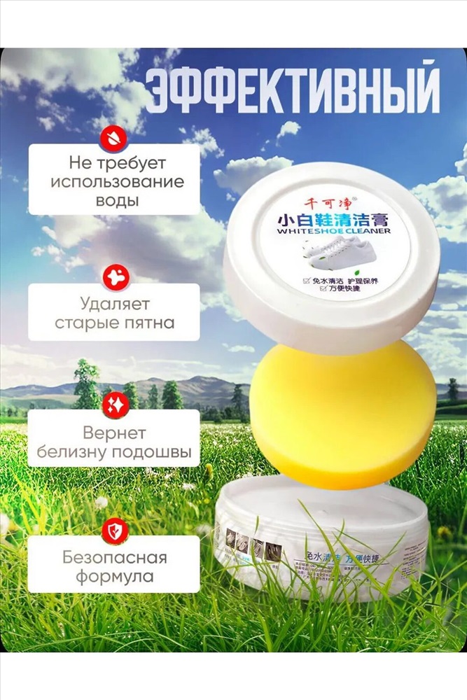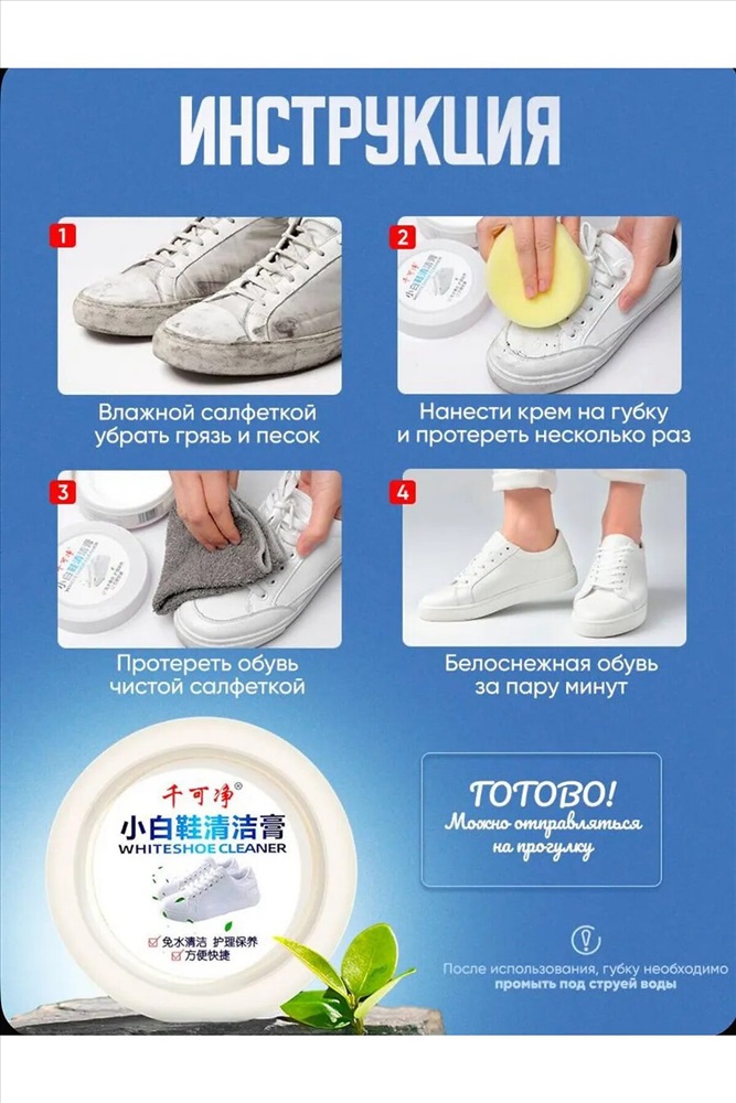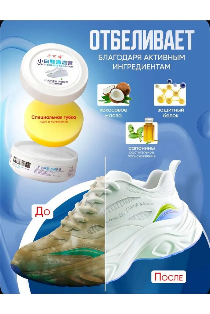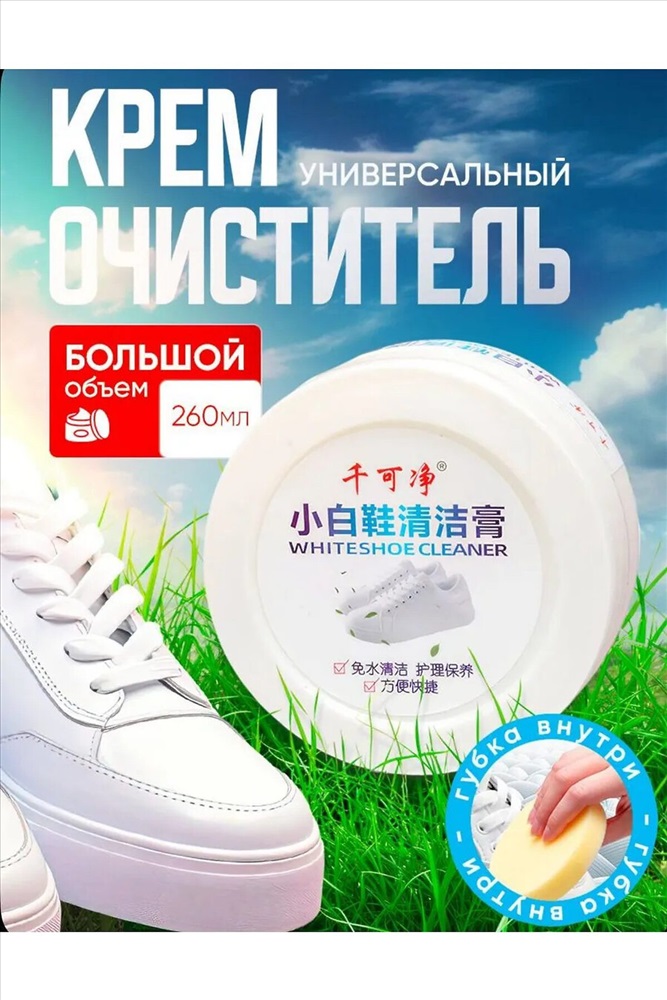 Очищающий бесцветный крем для обуви легко справляется с различными типами загрязнений без использования воды и моющих средств. Это средство идеально подходит для ухода за белыми кроссовками. Очиститель облегчает процесс очищения обуви от грязи без необходимости мыть её под краном. Брызги воды не летят на одежду, и не нужно ждать, когда обувь высохнет. Очищающая паста подходит для обуви из натуральной и искусственной кожи, эффективно чистит белые кроссовки и подошву. Благодаря натуральному составу, крем не портит обувь, не повреждает цвет, не оставляет следов и не наносит вред вашим рукам. Ваша белая обувь будет сиять. Перед нанесением крема, удалите песок и землю с обуви влажной салфеткой. Затем нанесите небольшое количество крема на губку и протрите поверхность. Крем очиститель для кожаной обуви справляется с загрязнениями эффективнее, чем пена или спрей для отбеливания обуви, создавая защитную влагоотталкивающую пленку. Наш крем для белой обуви популярен среди жителей Москвы, Санкт-Петербурга и других регионов. Уход за белой подошвой станет намного проще. Этот белый крем для кроссовок можно использовать не только для очищения обуви, но и для чистки мебели, салона автомобиля, сумок, бытовой техники и других типов поверхностей. Также его можно использовать как защитный бесцветный воск для обуви. Средство не чистит краску, клей, сверхтяжелые масляные пятна и застарелые пятна. Перед использованием крема отбеливателя рекомендуем протестировать его на небольшом невидимом участке изделия.