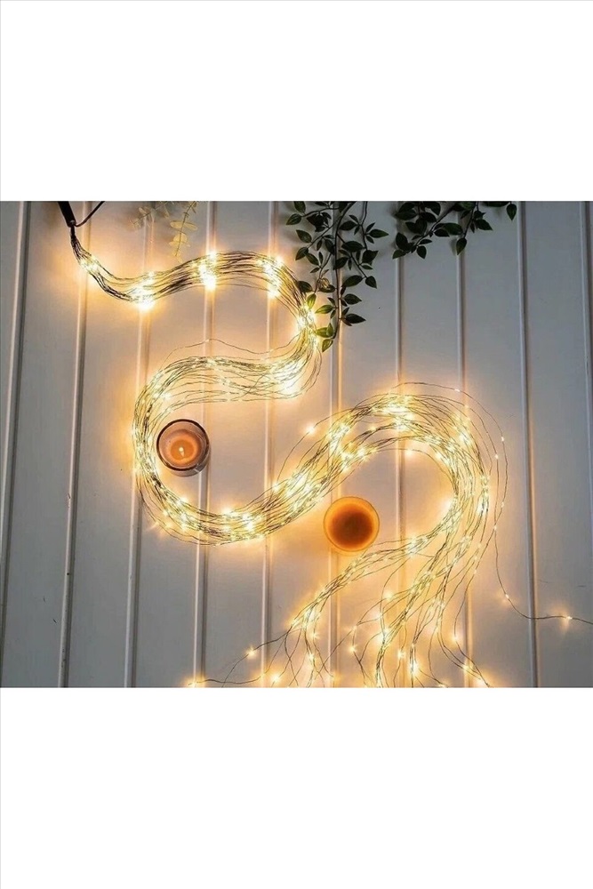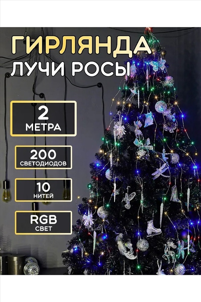 Гирлянда Лучи росы предназначена для оформления интерьера, украшения новогодней ели, создания праздничной атмосферы дома, на даче, в офисе. Гирлянда роса представляет собой несколько светодиодных нитей, исходящих из одной точки. Нити гирлянды выполнены из гибкого проволочного провода, что позволяет придать им любую форму. Гирлянда светодиодная Лучи росы хорошо подойдет и для украшения интерьера внутри помещений и для оформления уличных новогодних композиций. Количество светодиодов в гирлянде 200 штук, тип свечения - статический. Длина гирлянды 2 м идеально подходит для ёлки высотой 180 см. Работает от сети, длина провода 3 м.