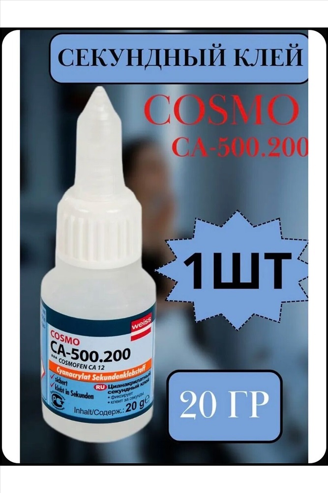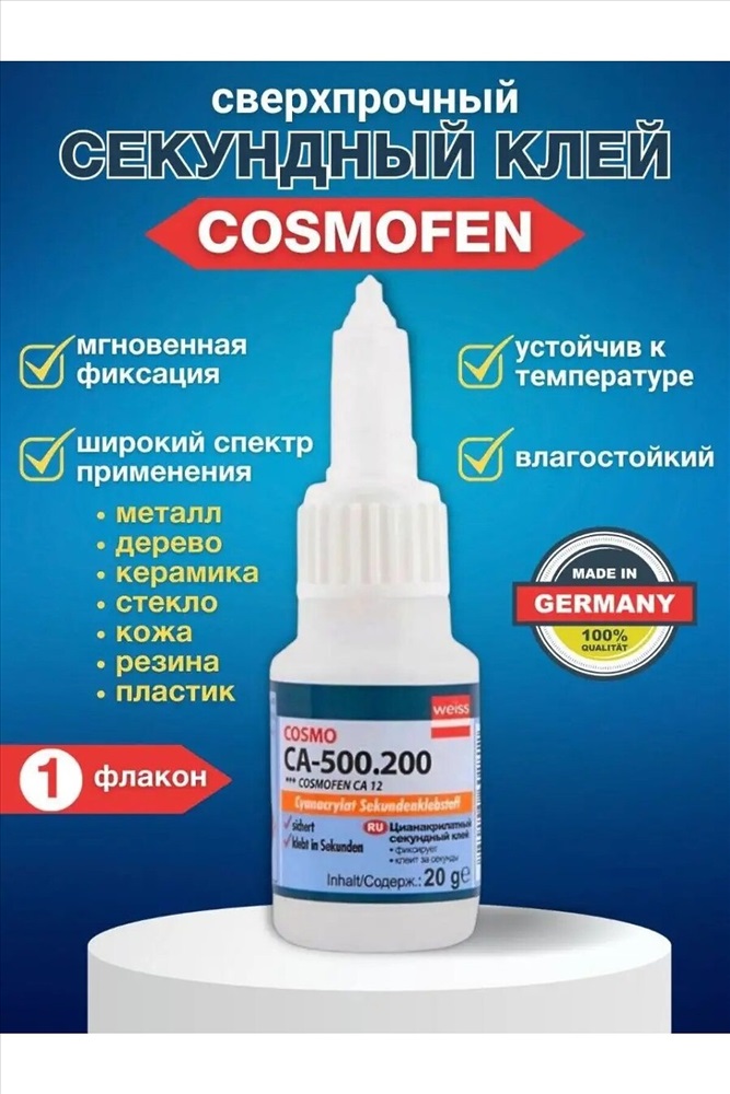COSMOFEN CA-500.200 Однокомпонентный, прозрачный, универсальный, быстросохнущий цианакрилатный клей. Применяется для склеивания кожаных, стеклянных, резиновых, металлических и керамических поверхностей. Время схватывания моментального клея Космофен составляет всего 5 секунд. Cosmofen клей является водостойким, долговечным и устойчивым к температурам. Применяется как для бытовых, так и для производственных целей.Клей супер момент может заменить вам клей момент, клей для обуви. Клей COSMOFEN особопрочный, потому может склеить даже металл, дерево, или керамику. Клей, предназначен для надежного склеивания и ремонта изделий.Супер клей Космофен - оригинальный секундный супер быстрый клей, обладающий высокими прочностными характеристиками.