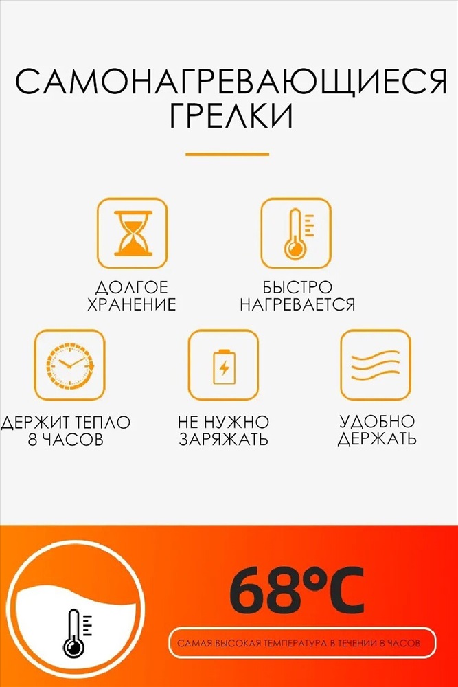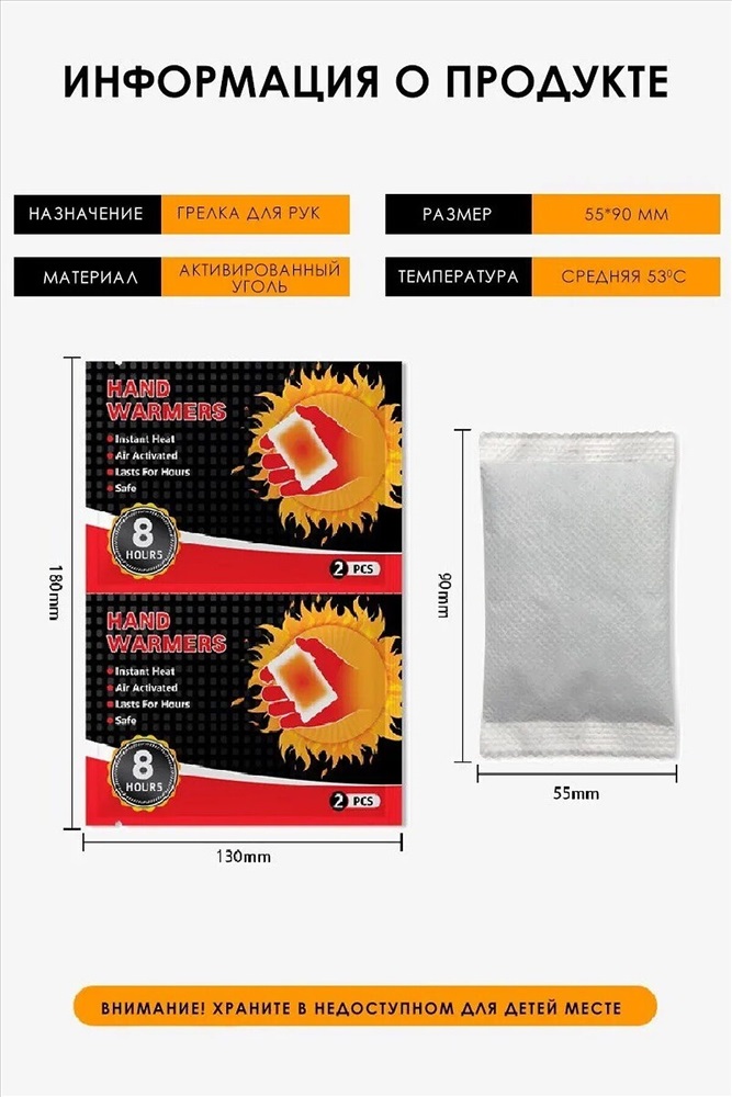 Забудьте о неприятном холоде и дискомфорте! Представляем вам идеальное решение для зимних прогулок и работы на свежем воздухе одноразовые грелки для рук и тела. Саморазогревающаяся грелка в зимние дни обеспечит вам тепло и комфорт в любых условиях. Она компактна и удобно помещается в кармане, что делает её незаменимым аксессуаром для путешествий и активного отдыха. Самонагревающаяся грелка для рук и тела представляет собой -пакетик, которое используется для согревания конечностей или определенных участков тела. Грелка содержит внутри себя натуральные ингредиенты, такие как уголь, соль или другие химические соединения, которые активируются при контакте с воздухом и начинают выделять тепло. Самонагревающиеся грелки обычно используются для обогрева в холодное время года, для уменьшения болевого синдрома, расслабления и разогрева мышц, а также для улучшения кровообращения, так же может применяться как грелка для новорожденных от коликов. Сфера применения грелки очень разнообразна, и она точно не подведет вас в любых жизненных ситуациях. Грелка имеет клейкий слой, с помощью которого можно закрепить грелку на внутренней стороне куртки, закрепить на варежках и обогреться на природе, так же можно положить в коляску. Подарите себе и своим близким комфорт и тепло с нашей грелкой! Закажите сейчас и наслаждайтесь уютом и теплом в любой непогоде!