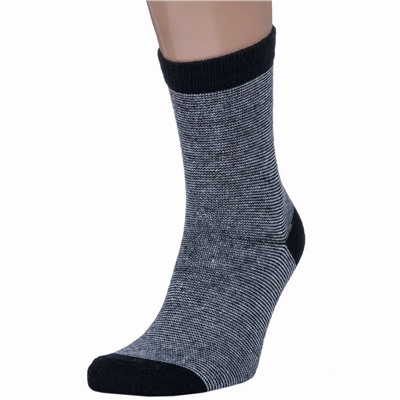 Утепленные носки для мужчин. Процентное соотношение: ангора 10%, вискоза 35%, полиэстер 30%, шерсть 20%. Оформлены узором в мелкую зигзагообразную полоску. Модель средней длины с двойным бортом и ощутимым уплотнением в месте шва на мыске. Борт, мыс и пятка в другом цвете.