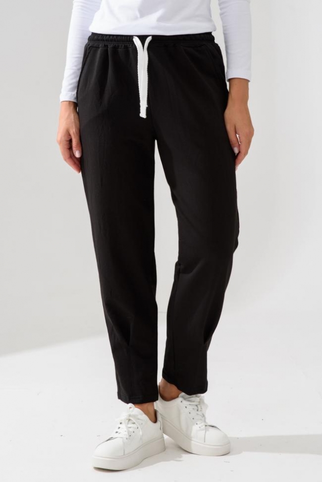 Брюки - бананы. Эластичный пояс с завязками для удобной посадки. Два глубоких боковых кармана. Защипы внизу штанин удлиняют ноги и создают женственный силуэт. Подходят всем. Широкая размерная линейка от 42-58. Для любого типа фигуры.
