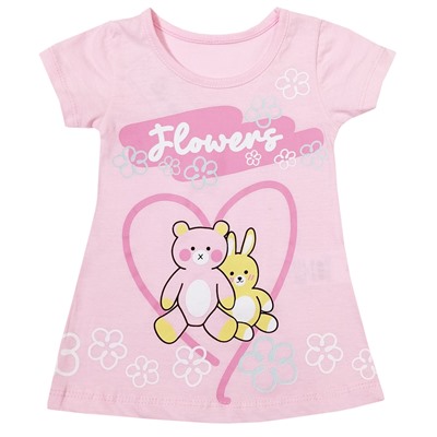 Футболка прямого кроя. Передняя половинка футболки декорирована принтом "медвежонок и зайчонок в сердце". Вырез горловины круглый, обработан бейкой из эластичного полотна в тон. Рукав короткий, втачной. Низ изделия и рукавов обработан швом вподгибку двойной строчкой.