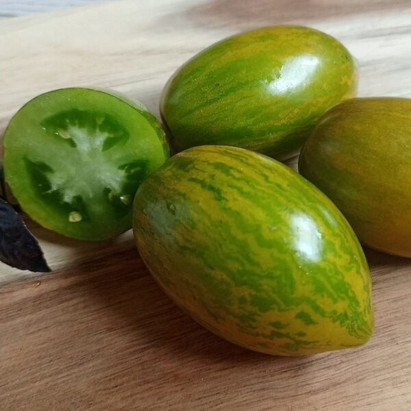 Детерминантный, высотой 0,8- 1,2 м, среднеранний. Листья крупные, морщинистые. Формирование минимальное. Плоды вытянутые, сливовидные, зелёные с тёмно-зелёными разводами -полосками, массой 120-180 г, мякоть густая с малым количеством ссмян, вкус сбалансированный с преобладанием сладости. Урожайность стабильно высокая.
