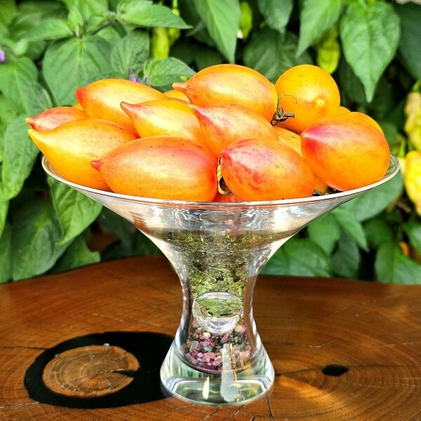 Среднерослый, 1,5м, среднеранний. Форма плодов сливка-капелька с острым носиком 25 грамм. В биологической спелости плоды становятся кремовыми с жемчужным оттенком и легким розовым муаром на плечиках. Имеют насыщенный фруктовый, сладкий вкус! Изумительное лакомство для детей и взрослых.