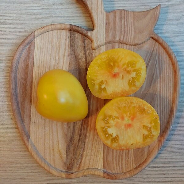 Индет, более 2.0 м. Среднеспелый. Плоды в виде сердца. Масса 200-500 грамм. Цвет: плоды бледно-лимонные, почти белые. Разрез бледно-лимонный с бледно малиновыми язычками. Мякоть плотная, сочная. Вкус замечательный, сладкий. Рекомендуется формировать в 2 стебля с подвязкой, так как кусты тонкие, изящные. Сорт подходит для свежего потребления, экзотических соусов и соков.