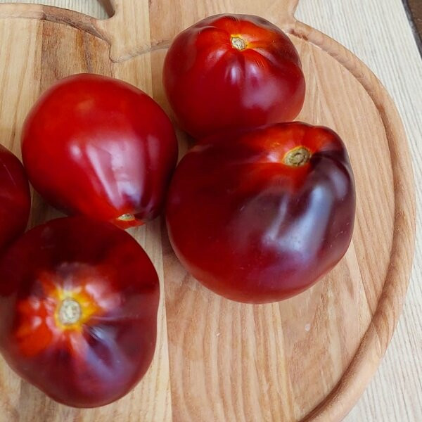 Индет., в ОГ высотой 1.5 м, лист обычный, среднего срока созревания. Плоды сердцевидно-грушевидные, в среднем от 100 до 200г. Интересный окрас плодов: оранжево-бронзовые снаружи, с темным антоцианом на плечиках и красной мякотью внутри. Мякоть плотная, сладкая, с насыщенным ароматом. Урожайный.