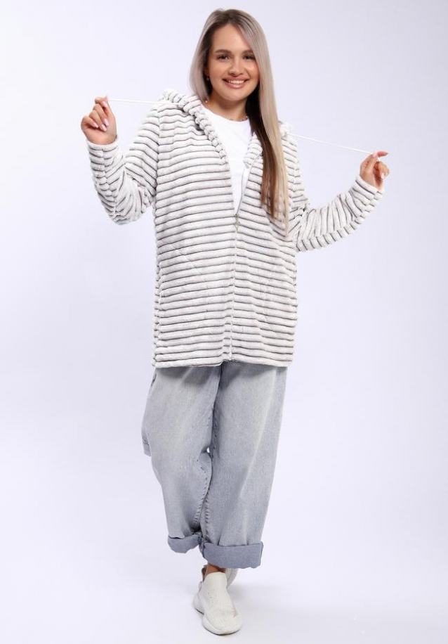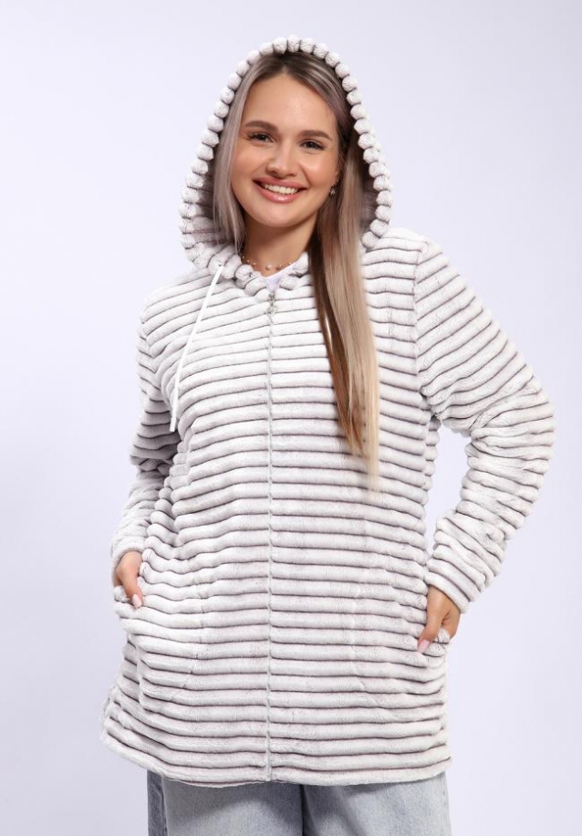 Толстовка с капюшоном на молнии и двумя карманами выполнена из мягкого и теплого велсофта, похожего на шиншиллу. Удлиненная модель обеспечивает дополнительное тепло и комфорт, идеально подходит для холодных дней. Мягкая текстура и приятное ощущение на ощупь делают эту толстовку стильным и уютным элементом гардероба.