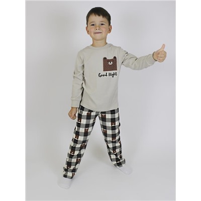 Фуфайка-прямая, рукав втачной, длинный на манжете из ластика. Печать на переде. Горловина обработана ластиком. Брюки-длинные прямые, верхний срез подшит с резинкой.