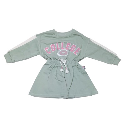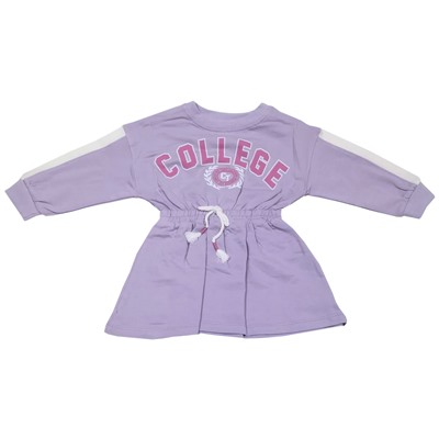Платье для девочки oversize, из эластичного х/б трикотажа, с крупной надписью на груди "COLLEGE". Платье отрезное по линии талии, собрано на резинку и украшено бантиком из шнурка. Горловина и рукава отделаны трикотажной манжетой. Рукава со втавкой из контрастной ткани.
