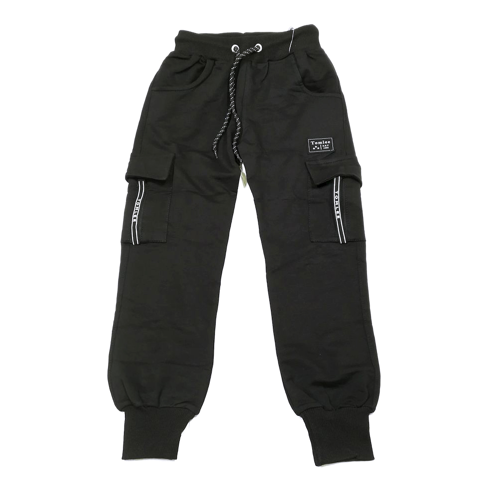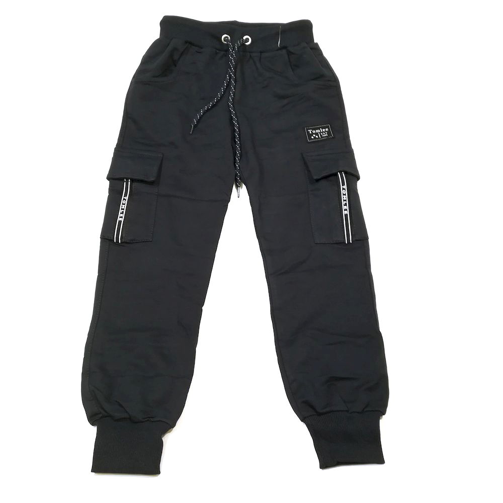 Штаны для мальчика, из эластичного х/б футера, снизу на трикотажных манжетах, в поясе на манжете с резинкой и шнурком. Два боковых прорезных кармана. Два боковых накладных кармана, с клапанами и декоративными молниями. Украшены фирменной нашивкой.