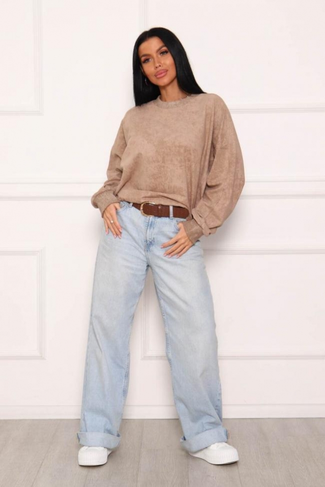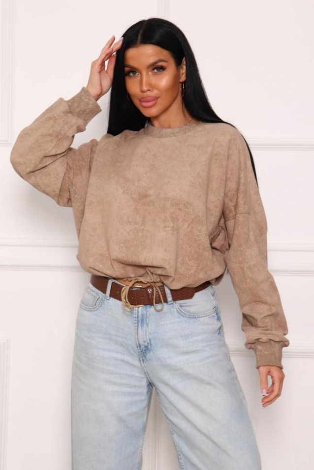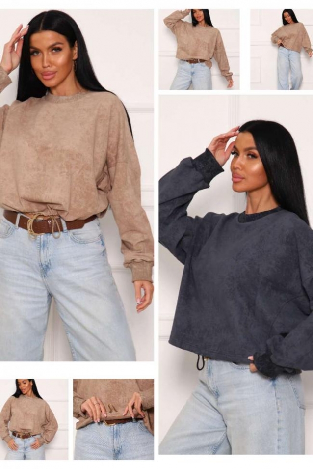 Свитшот женский сложного кроя, из трикотажного полотна с напылением, которое создает эффект стиля винтаж. Свитшот свободного облегания, рукав летучая мышь, на манжете. Горловина круглой формы, обработана обтачкой. Низ изделия на регулируемой кулисе со шнуром. Манжеты и обтачка горловины выполнены из кашкорсе в цвет основной ткани.
