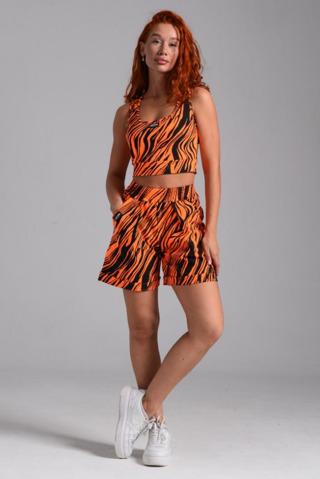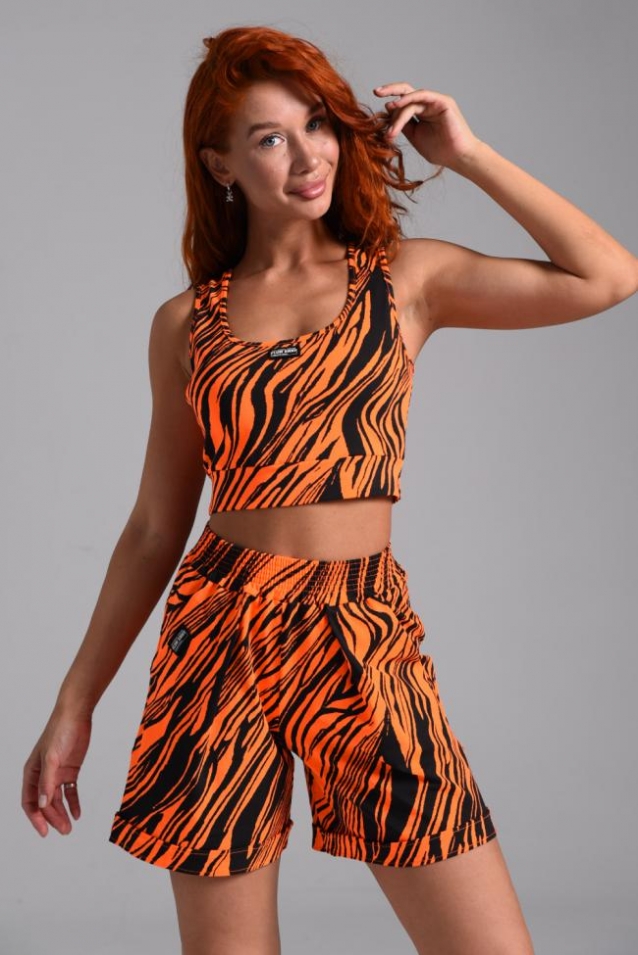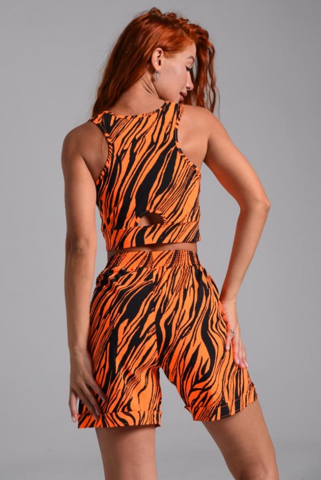 Комплект состоит из топа и шорт. Топ на узких бретелях, с округлой горловиной на полочке и вырезом борцовка сзади. Горловина, проймы и вырез на спинке обработаны бейкой из основного полотна. Шорты на поясе, свободные, с боковыми карманами, с декоративными отворотами по низу. В верхней части передних половинок по шву притачивания пояса расположены складки.