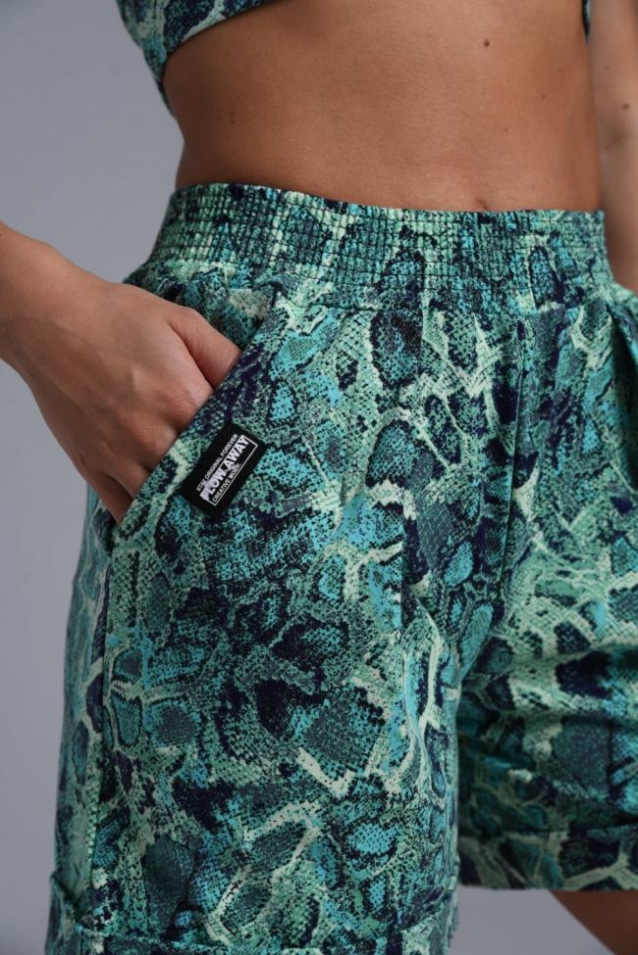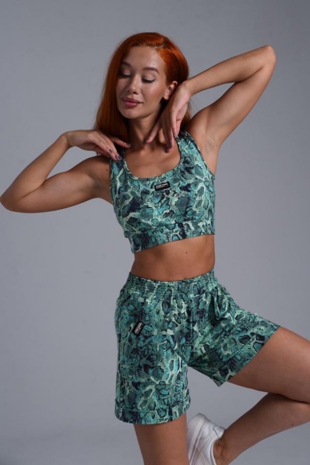 Комплект состоит из топа и шорт. Топ на узких бретелях, с округлой горловиной на полочке и вырезом борцовка сзади. Горловина, проймы и вырез на спинке обработаны бейкой из основного полотна. Шорты на поясе, свободные, с боковыми карманами, с декоративными отворотами по низу. В верхней части передних половинок по шву притачивания пояса расположены складки.