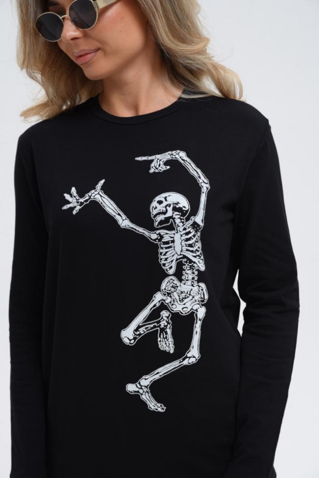 Лонгслив снова в моде и прочно обосновался в базовом гардеробе современного человека. Удобная трикотажная кофта представляет собой футболку с длинным рукавом, которую можно использовать как самостоятельный элемент, так и носить под пиджак, толстовку или рубашку. Лонгслив выполнен из высокоплотного хлопкового трикотажа и является невероятно комфортным и удобным. Футболка с длинными рукавами имеет прямой базовый крой и классическую линию плеча. Лонгслив - это неформальный стиль, когда на футболку можно надеть клетчатую рубашку и сочетать с кедами и джинсами. За счет натуральной ткани лонгслив можно носить в качестве домашней одежды или нательного белья, одежды для сна, тренировочной спортивной одежды и военной экипировки. Если вы хотите силуэт оверсайз нужно взять на размер или два больше, ориентируйтесь по таблице замеров. Принт светится в темноте!