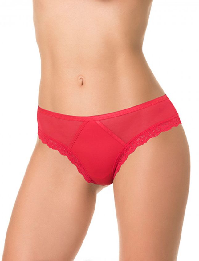 Трусы-бразилианы со средней линией талии из шелковистой микрофибры и полупрозрачной сетки. Полотна удачно комбинируются с эластичными тесьмами с атласным блеском. Имитация шнуровки на задней детали и отделка ножек узким кружевом добавляет модели пикантности.