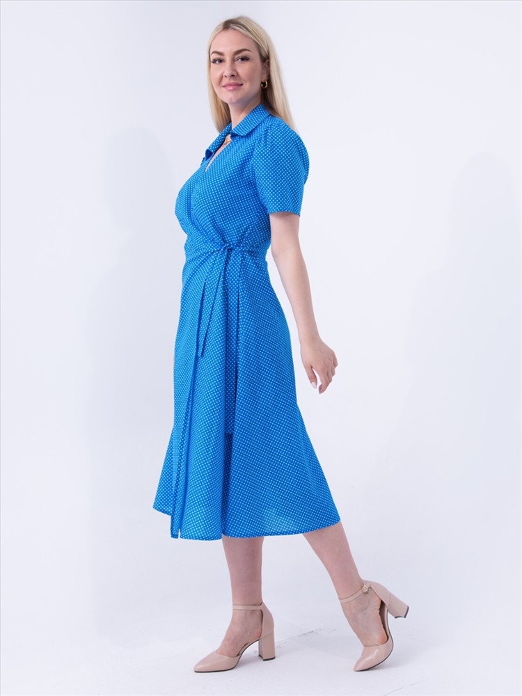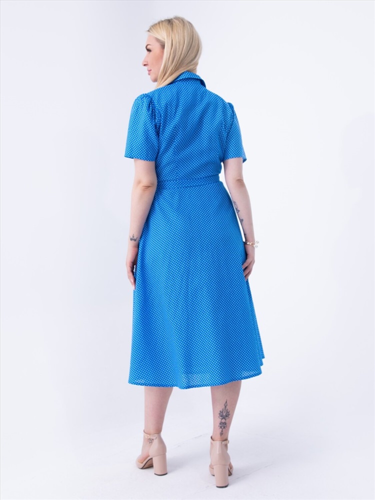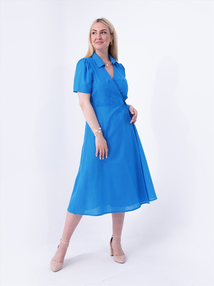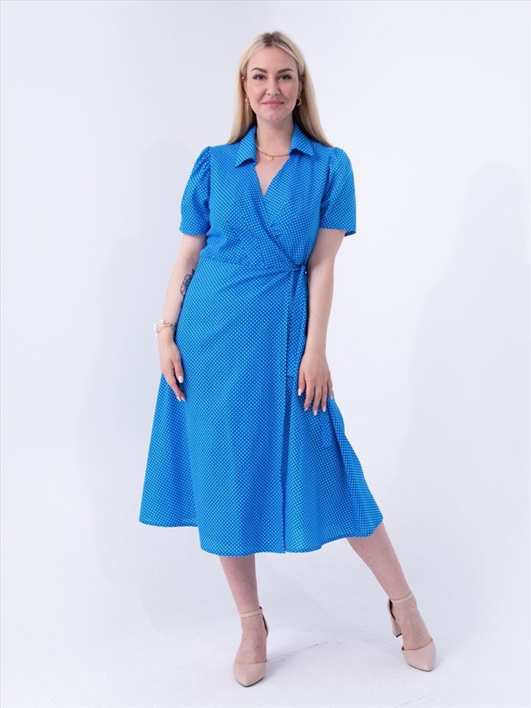 Платье из хлопка в горошек на запах.Вырез горловины V-образный.По горловине отложной воротничек.Рукав втачной короткий.Очень легкое летнее платье .Модель на запах скроет недостатки фигуры.В платье будет комфортно и на работе и на отдыхе. .Модель на фото в размере 48.Параметры модели на фото 94/77/104 рост 178 см.