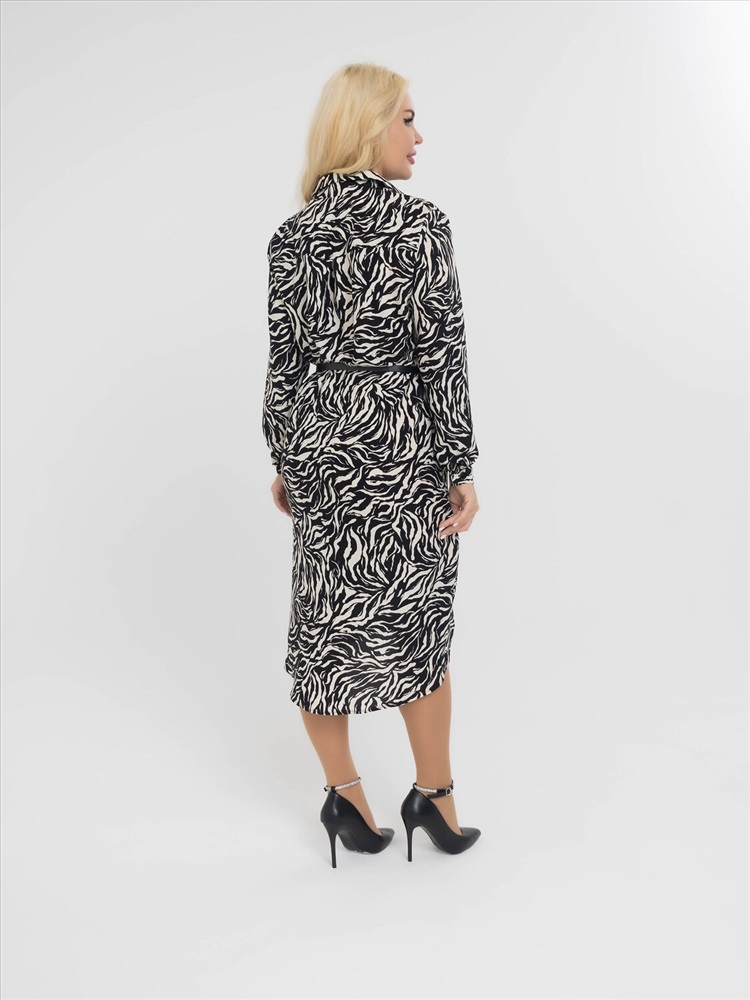 Платье-рубашка из текстильной ткани с принтрм "зебра".Воротник отложной на стойке.Рукав втачной длинный.В боковыхшвах разрезы.Низ изделия разной длины.Параметры модели на фото 100/80/102 рост 170.На модели размер 48.